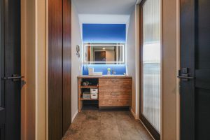 子世帯は廊下から脱衣室に入り、親世帯はリビングから脱衣室までつながっているので廊下に出ることなく脱衣室に入れます。